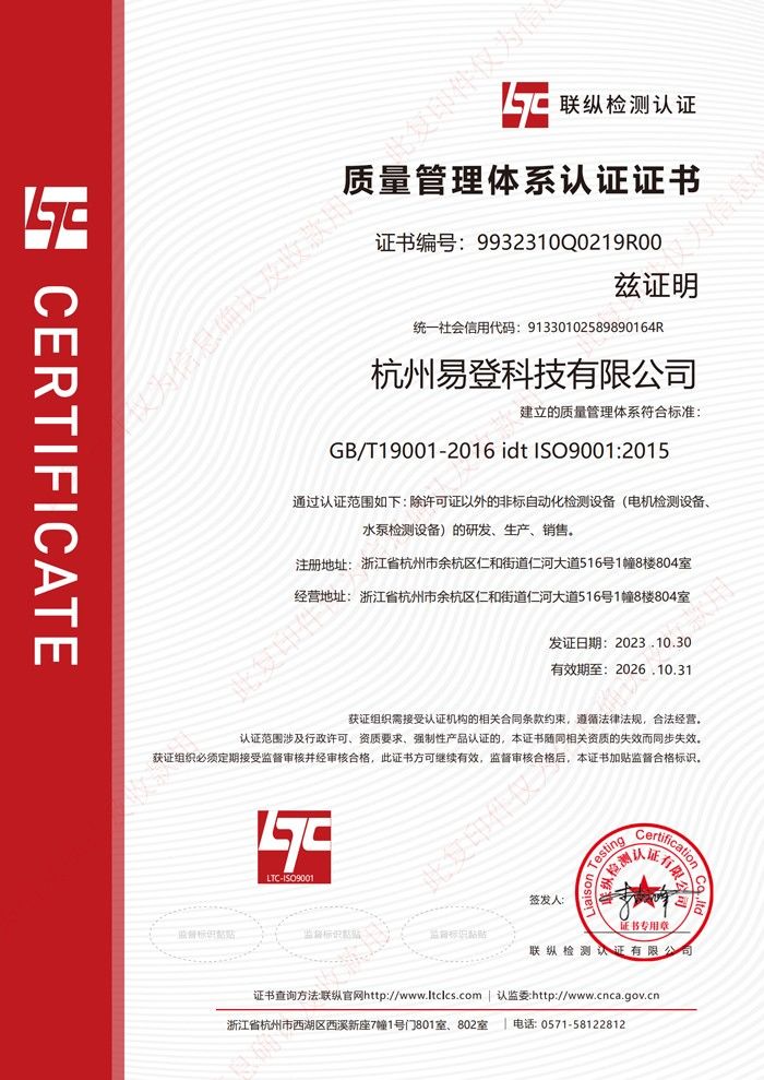 設(shè)備(電機(jī)檢測設(shè)備、水泵檢測設(shè)備)的研發(fā)、生產(chǎn)、銷售。ISO質(zhì)量體系認(rèn)證證書的成功申請標(biāo)志著我司在企業(yè)管理的